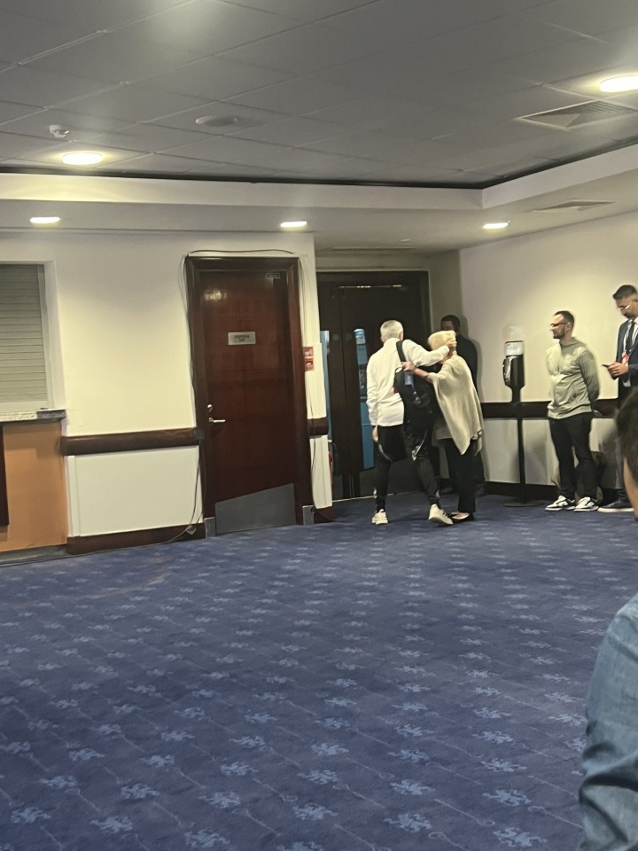 在欧冠新闻发布会截止后,穆里尼奥与切尔西的新闻官特蕾莎-康妮莉拥抱,取得了在场其他东说念主的掌声。
