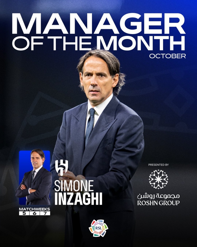 11月5日讯 本周三,沙特联赛官方告示利雅得月牙主帅西蒙尼-因扎吉当选10月份的最好教练。