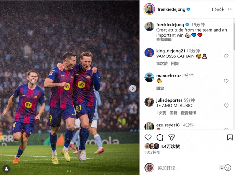 德容社媒晒出与莱万庆祝进球的合照,配文:“球队展现了很棒的派头,获利一场进攻的得手。”
