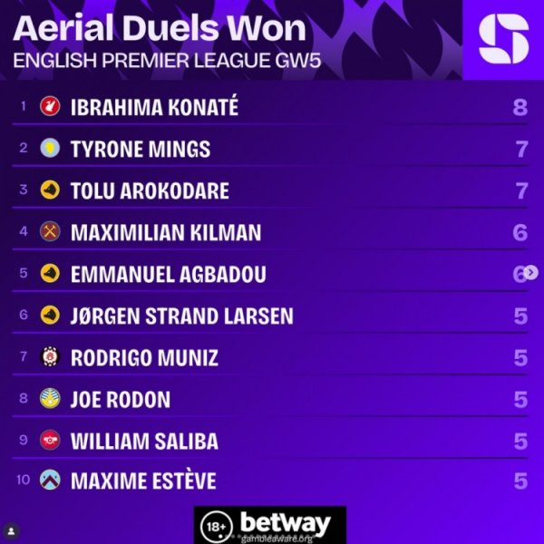 英超第5轮获取争顶次数榜:科纳特8次居首,明斯、阿洛科达尔7次
