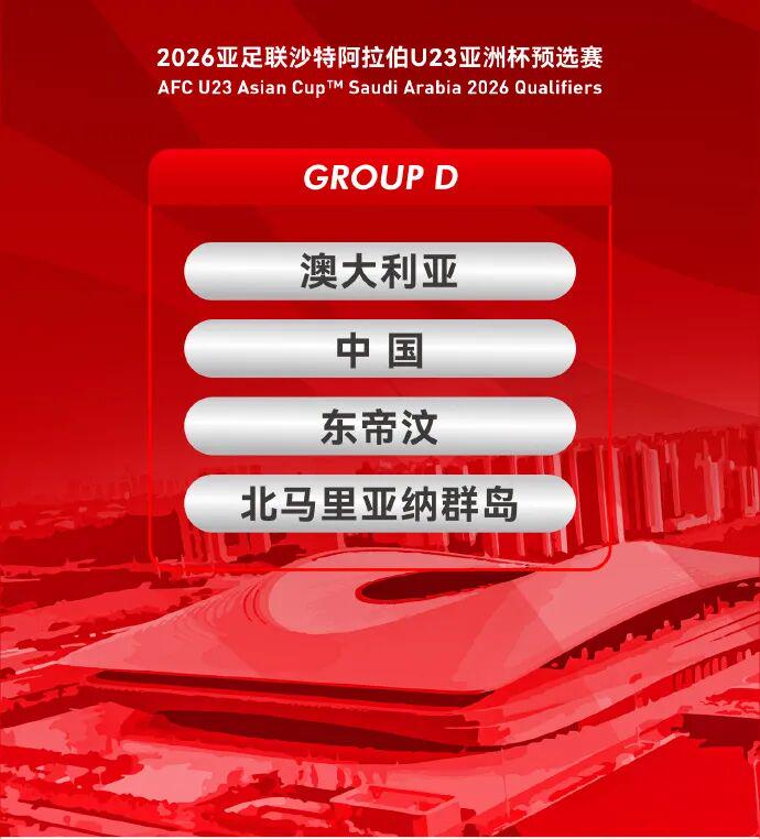 9月3日至9日历间,2026亚足联U23亚洲杯预选赛将在陕西省西安市进行。本次预选赛共分为11个小组,各小组第别称和4个得益最佳的小组第二名,将晋级来岁在沙特阿拉伯进行的U23亚洲杯决赛阶段比赛。中国U22男足与东帝汶队、北马里亚纳群岛队和澳大利亚队同在D组。