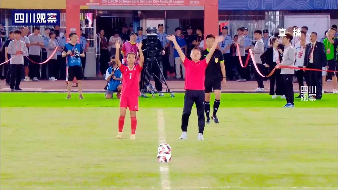 ▲雍旭东与张成珂动作开球嘉宾站上“川超”联赛赛场